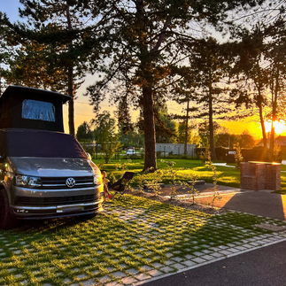 We arrived to a car park mostly filled with big white motorhomes - so naturally, our little dark VW T6 stood out 😅 - but there was still plenty of space. And unlike many stopovers, it actually felt relaxed enough to set up a bit, get the chairs out, and enjoy the evening properly.